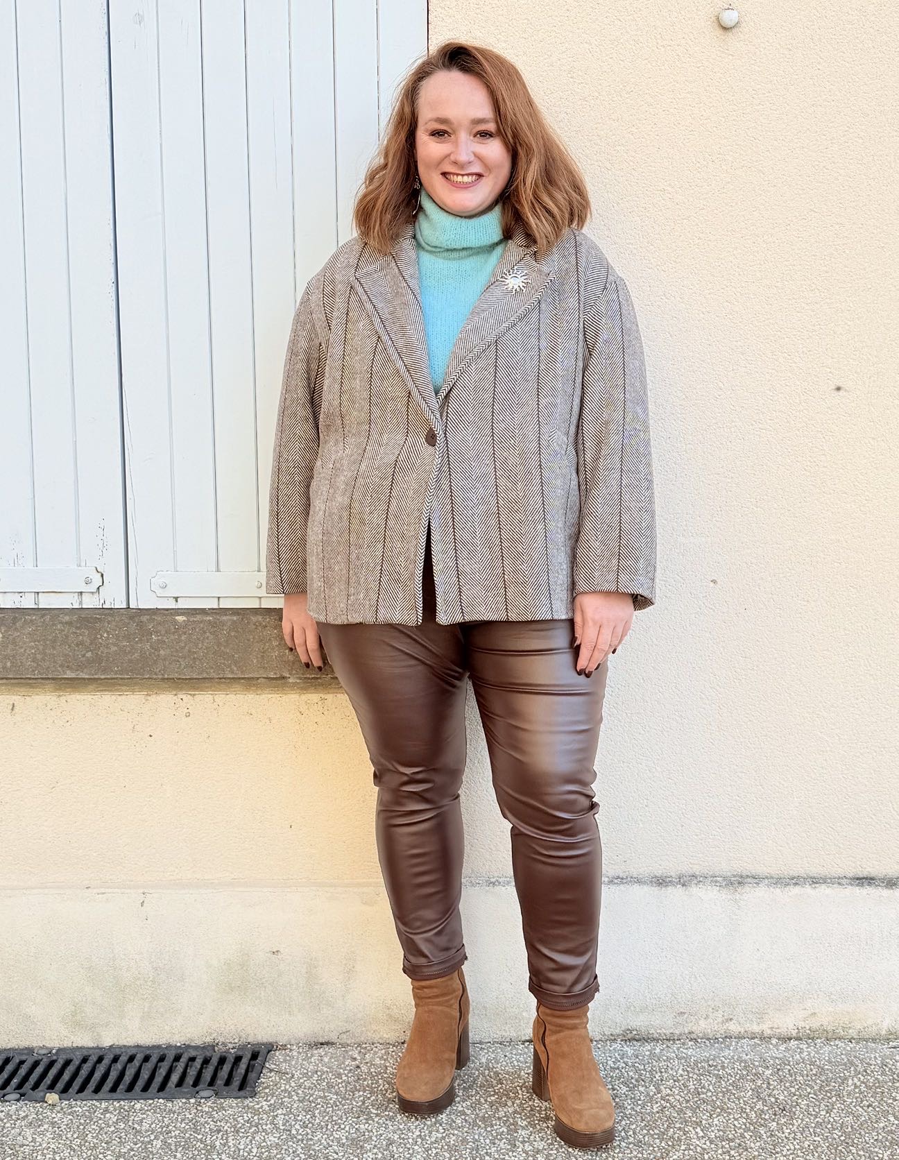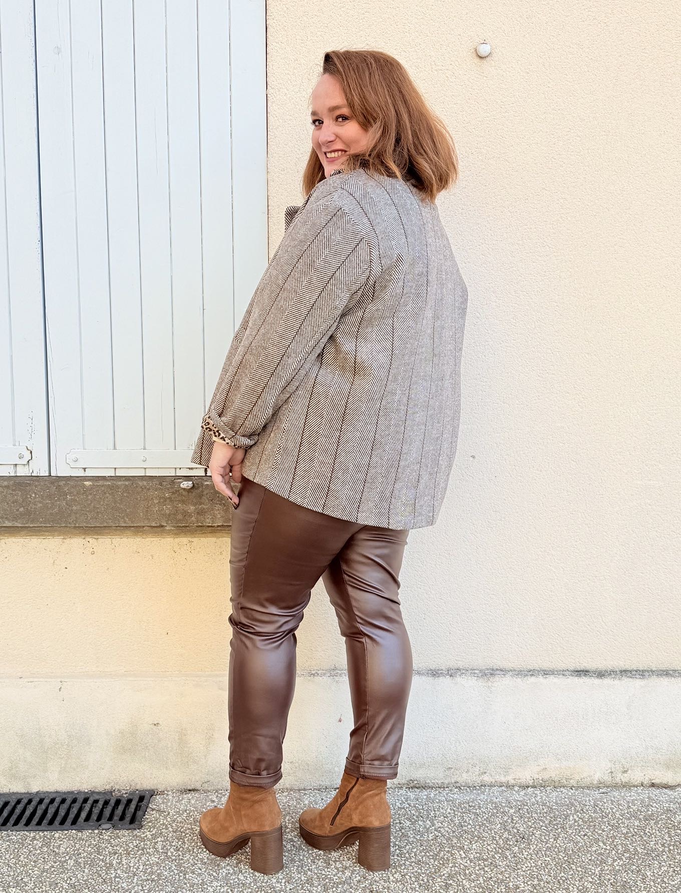 Le blazer Harrison grande taille a un motif chevrons, c’est comme un petit manteau avec une doublure en léopard.