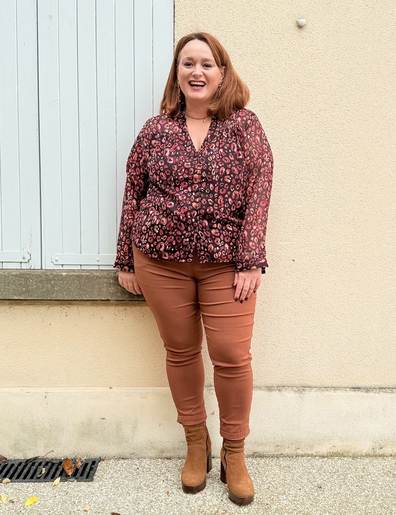 La chemise Luna grande taille a un imprimé léopard, elle est en voile, avec des manches longues.