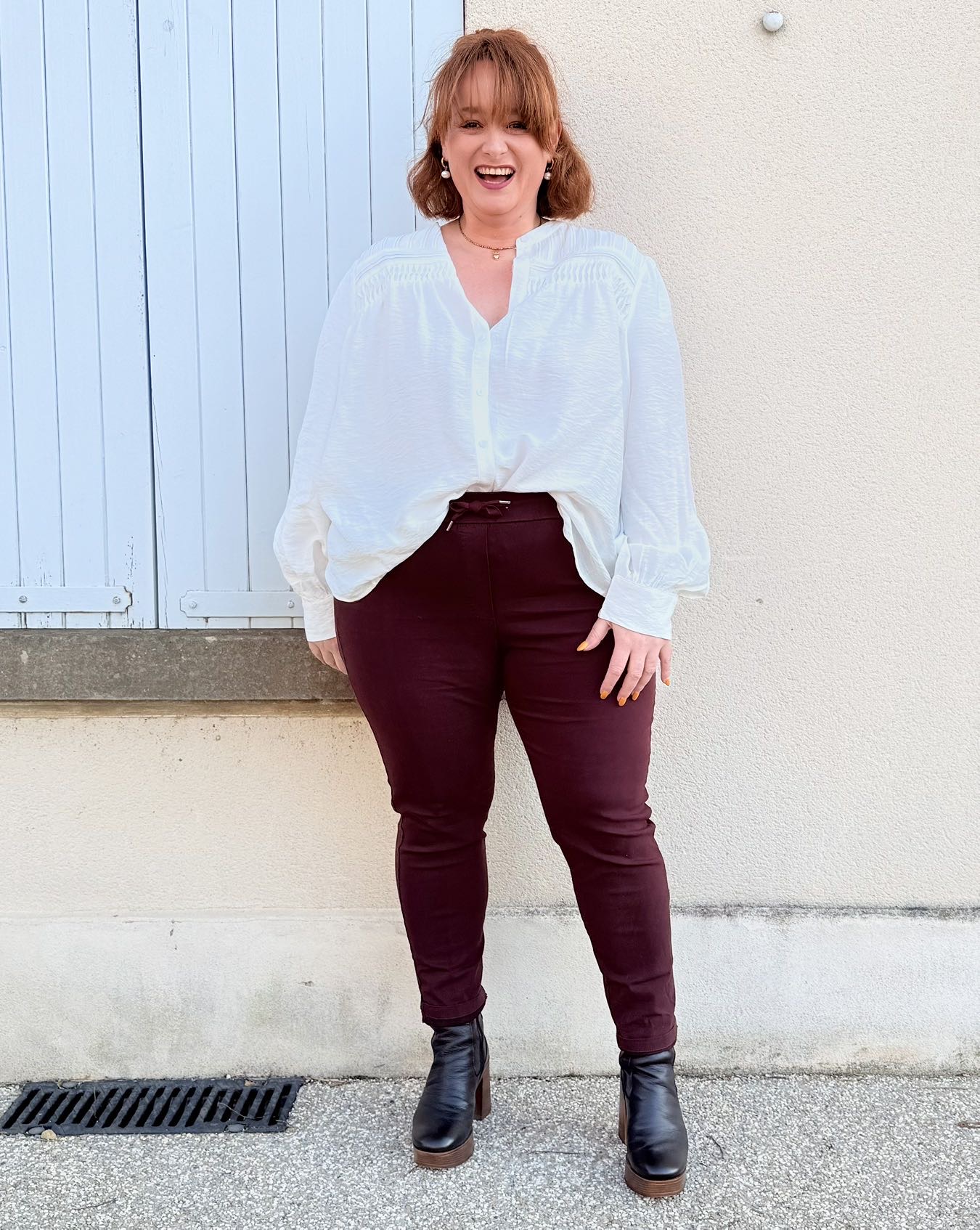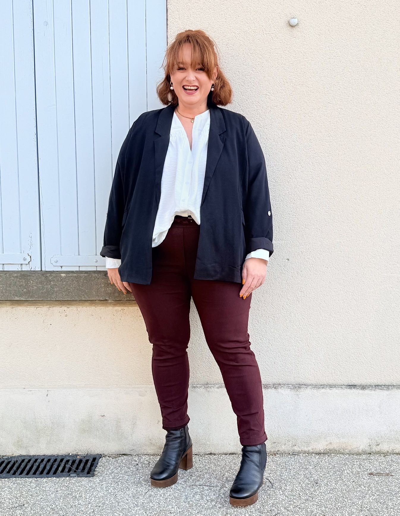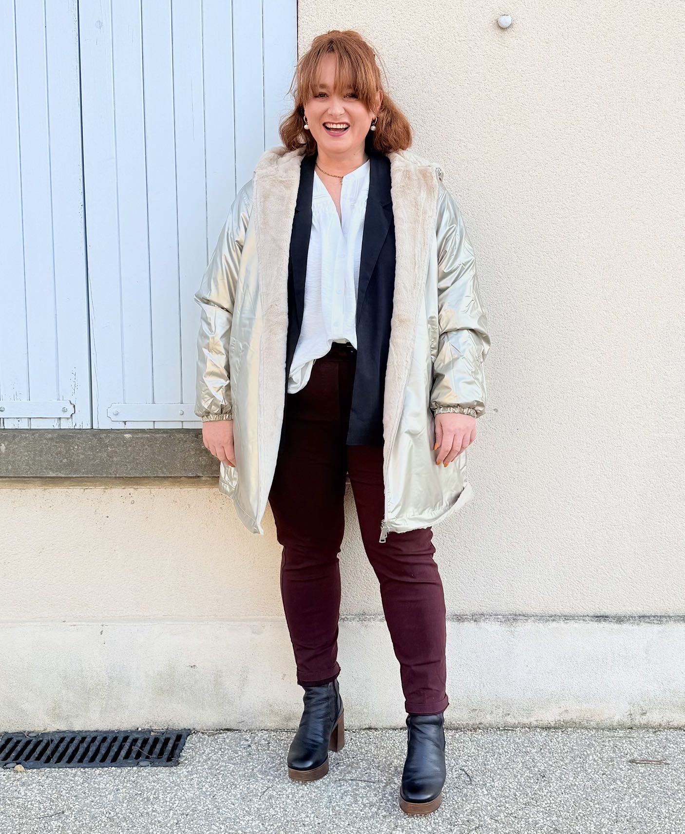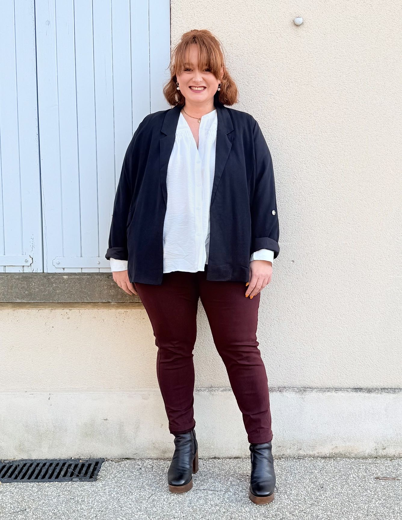 Marion porte sa taille habituelle 48/50 et mesure 1m65.