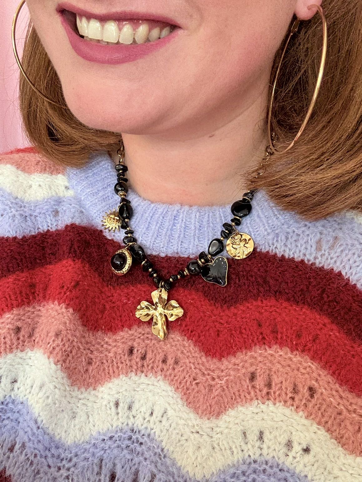 Le collier Tina a des perles en résine, des charms accrochés dorés et une chaine en acier inoxydable.