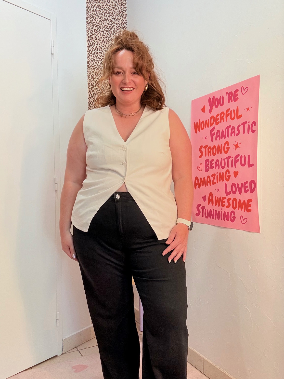 Marion fait habituellement du 48/50, porte la taille 48 et mesure 1m65.