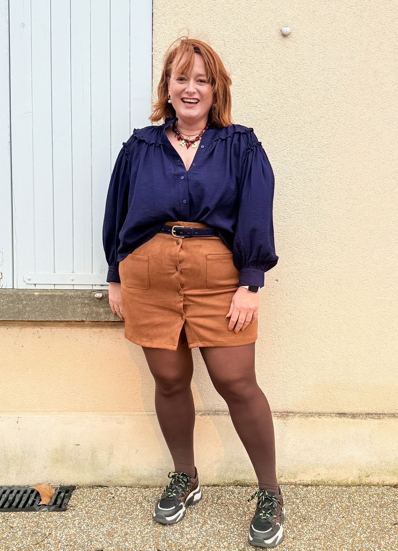 La jupe Doris grande taille est dans une matière super confortable, avec des boutons et poches, imitation daim.
