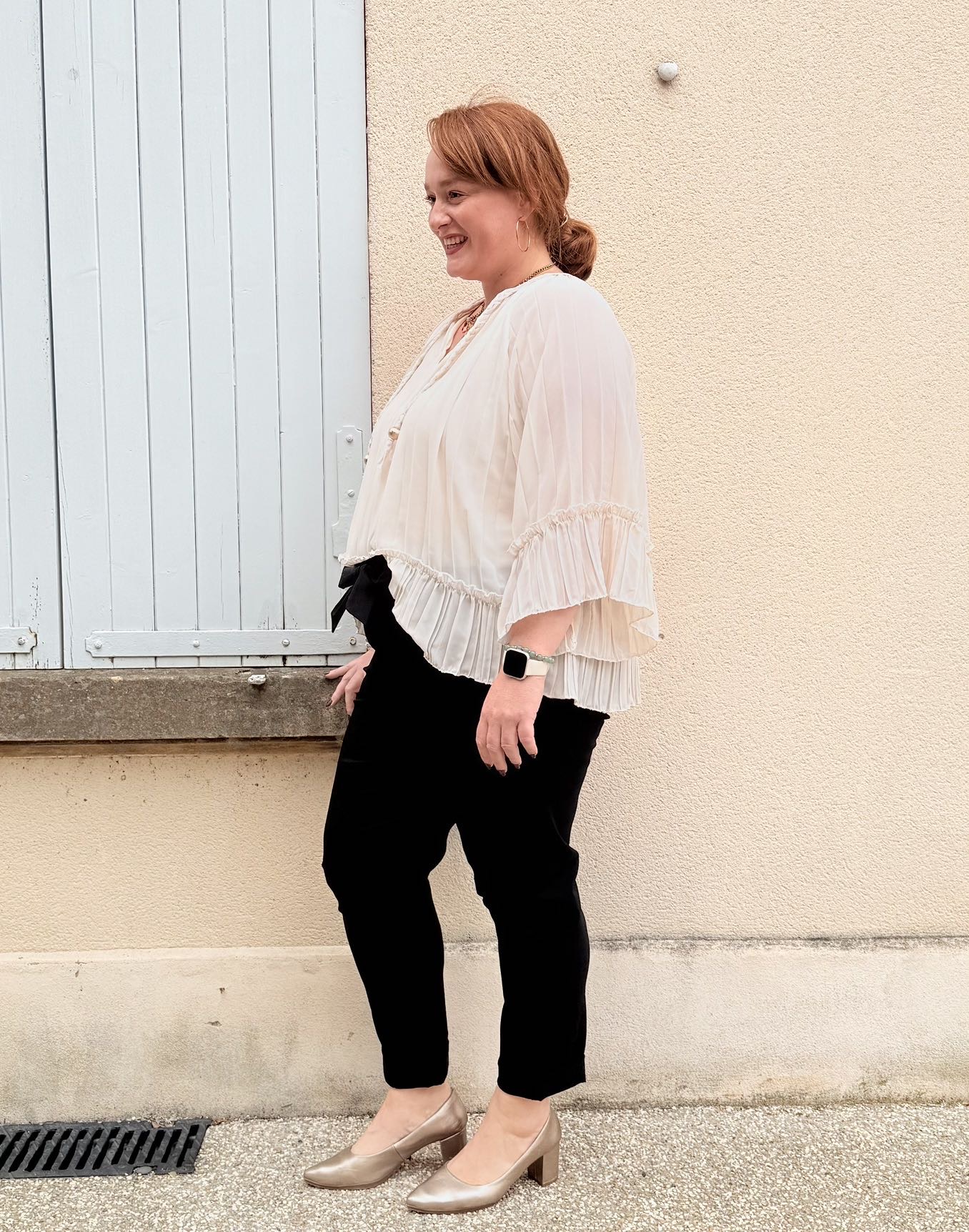 Marion porte sa taille habituelle 48/50 et mesure 1m65.
