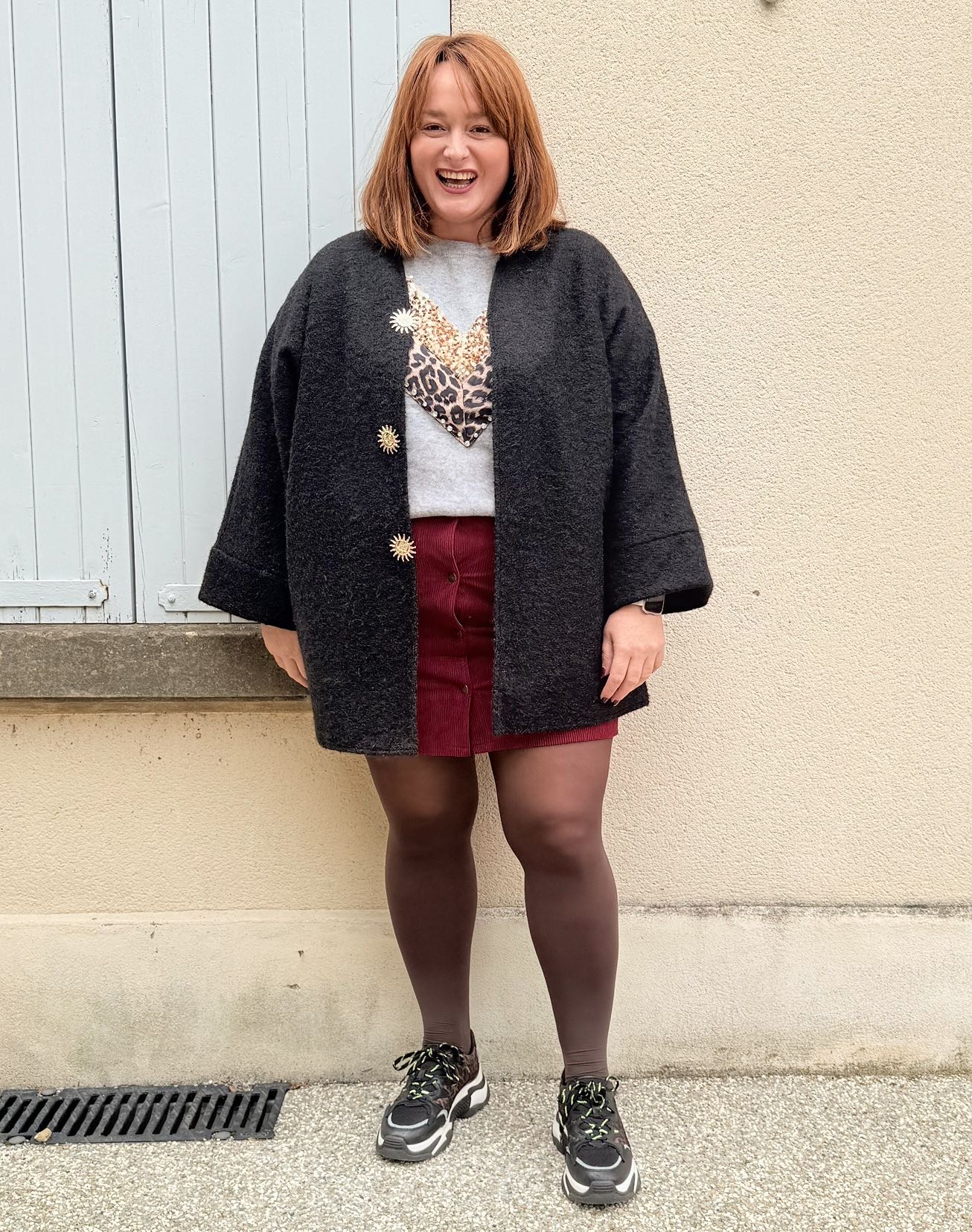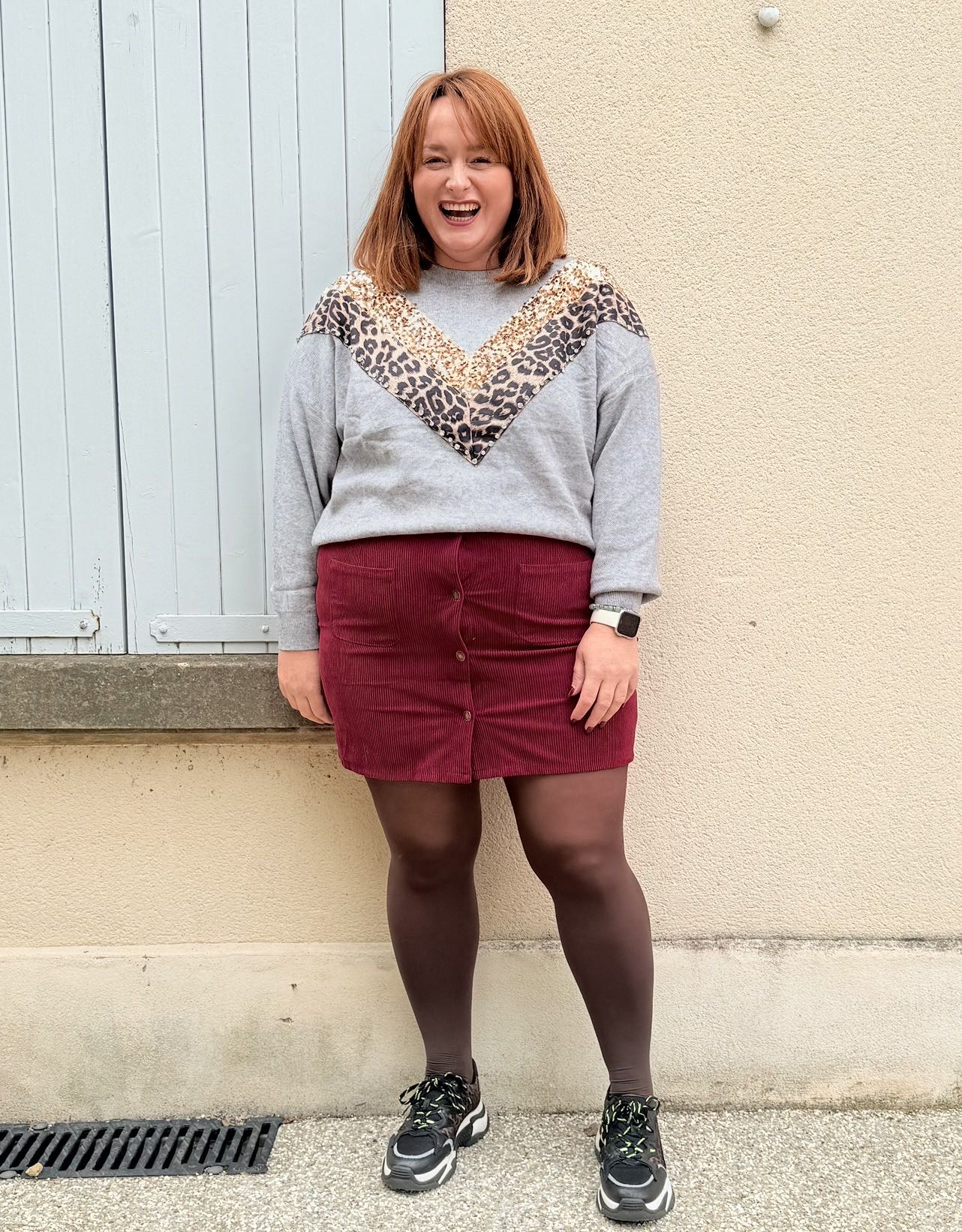 La jupe Ella grande taille est super confortable, douce, elle est en velours, avec des boutons et poches sur le devant.