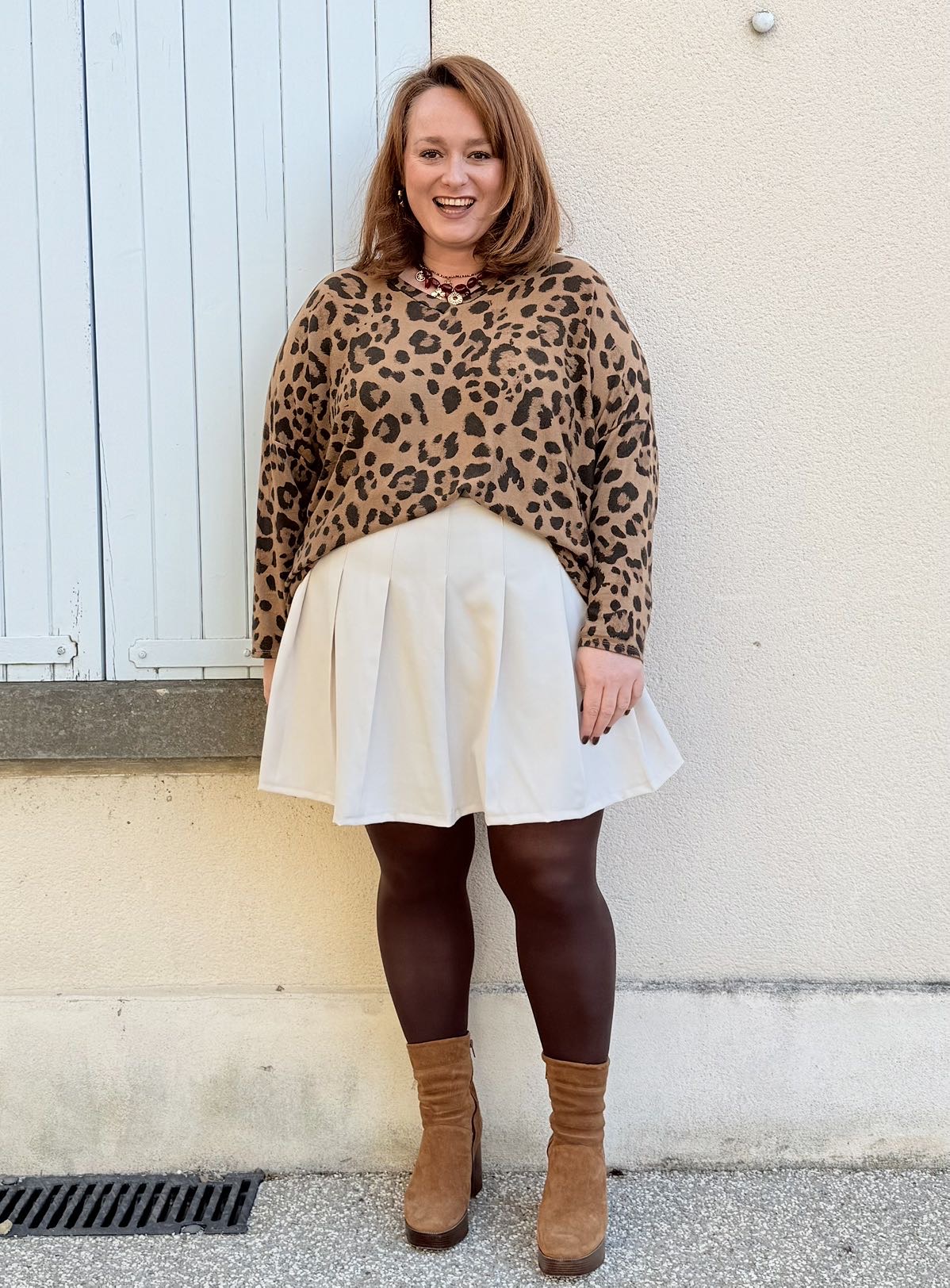 La jupe short Noa grande taille est plissé, courte, avec une fermeture éclaire et un short intégré.