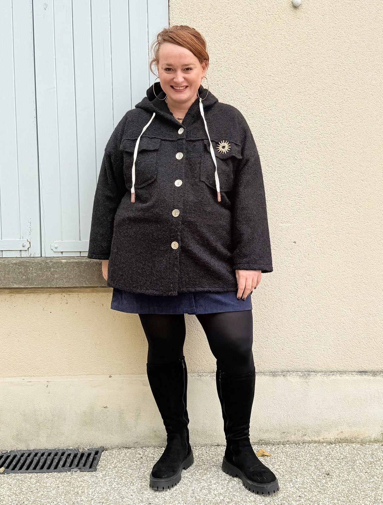 Le manteau Frédérique grande taille est léger, a une capuche, se ferme avec des boutons, a 2 poches et une jolie broche.
