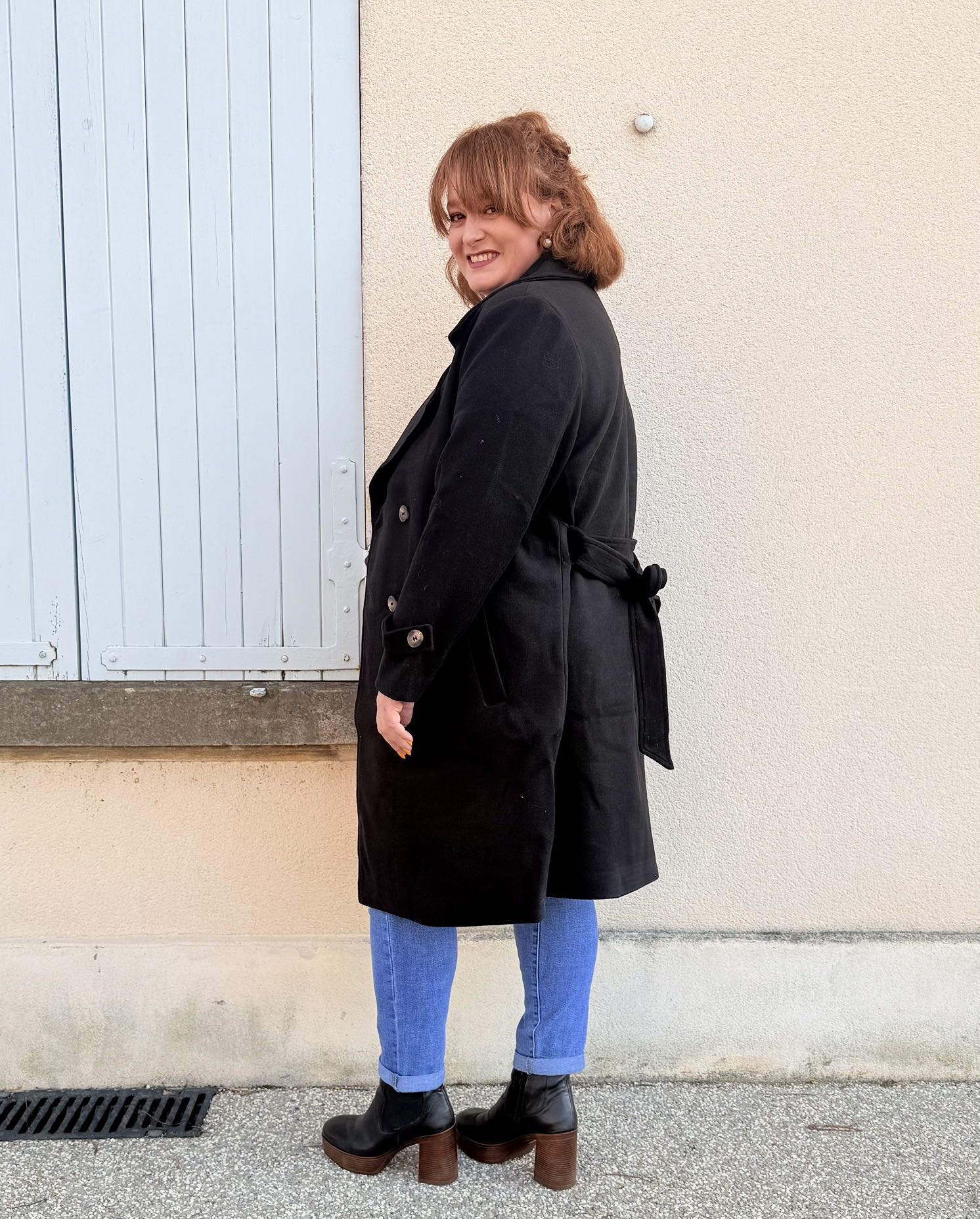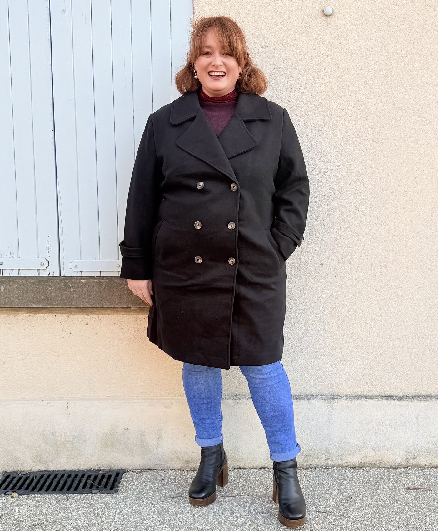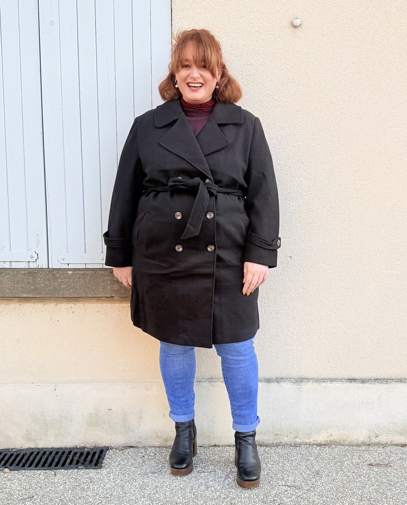Le manteau Amanda grande taille est un vrai basique : il a une coupe droite, se ferme avec des boutons et une ceinture et il a des poches.