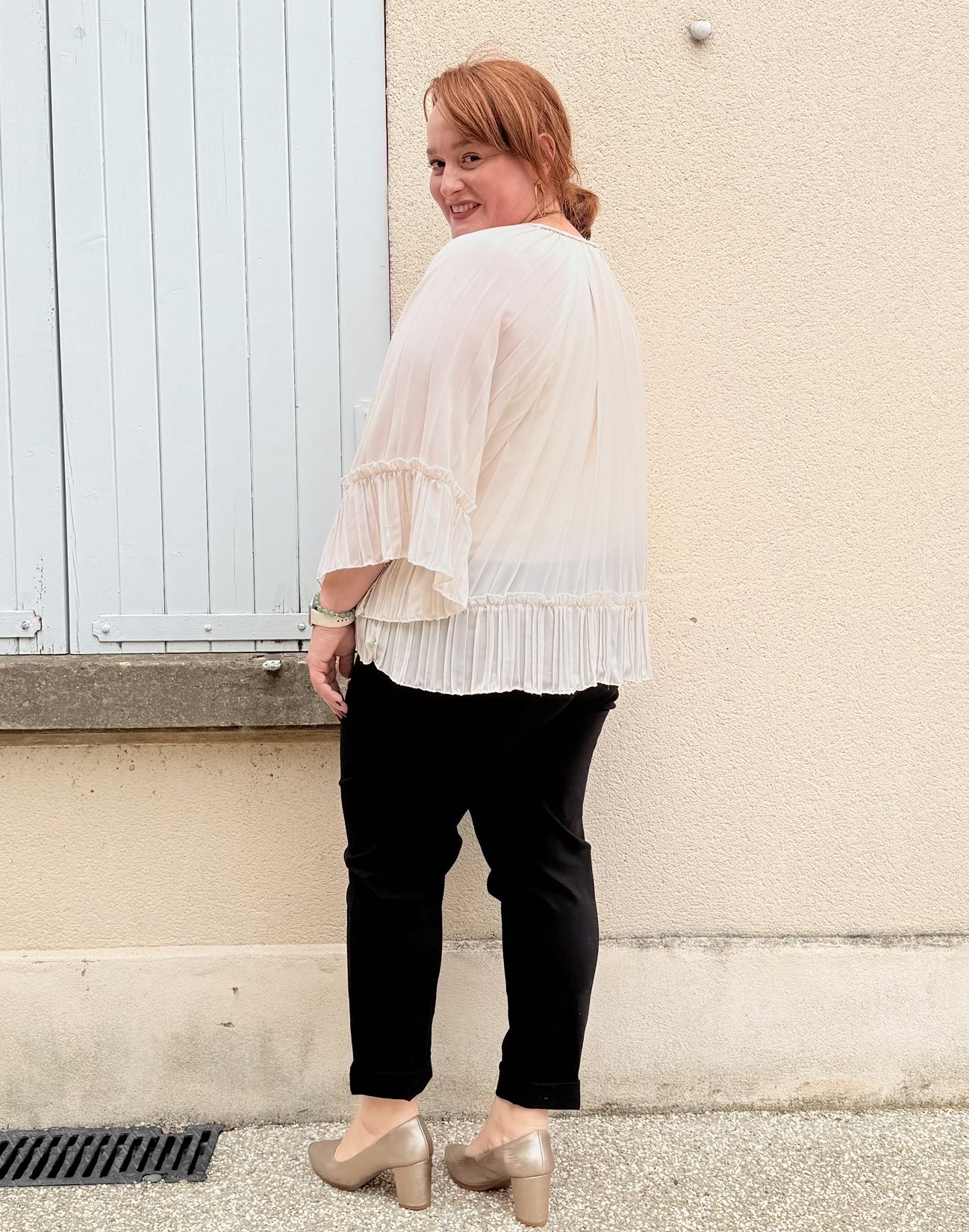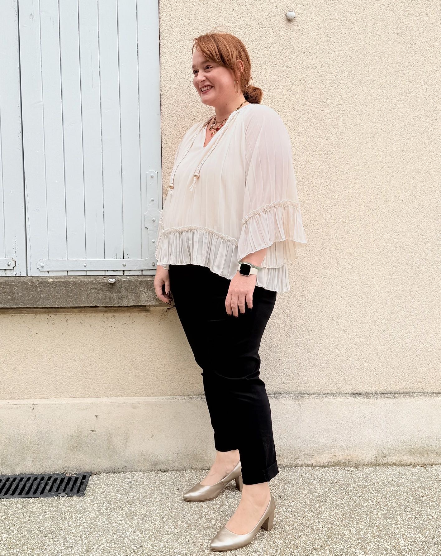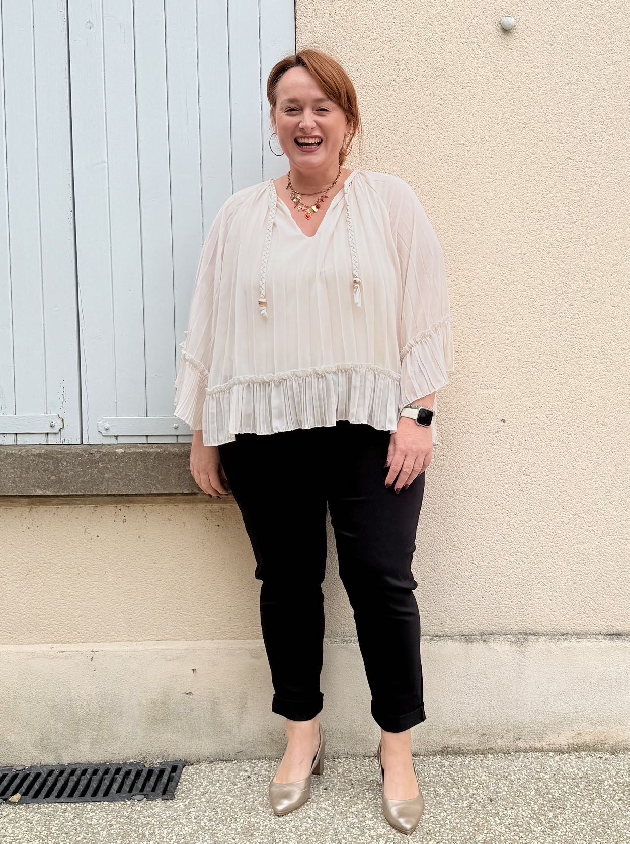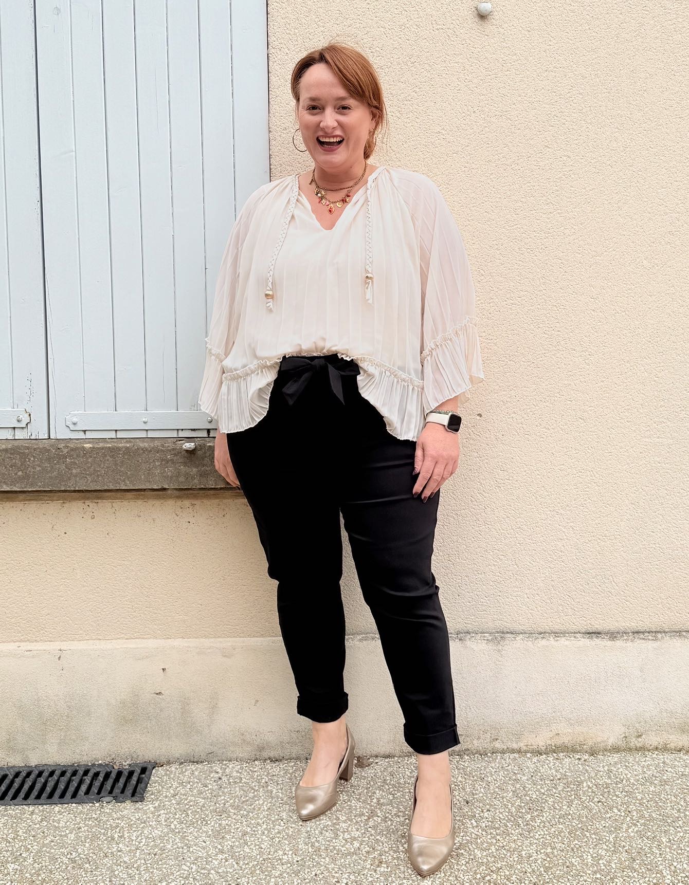 Le pantalon Sonia grande taille est super confortable, a une coupe carotte et un lien à la taille. On pourra le porter avec nos blazers.