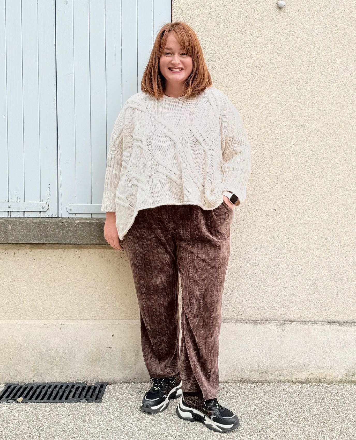Le pull Glenda grande taille a une coupe oversize, il a des torsades, il est très doux et confortable.