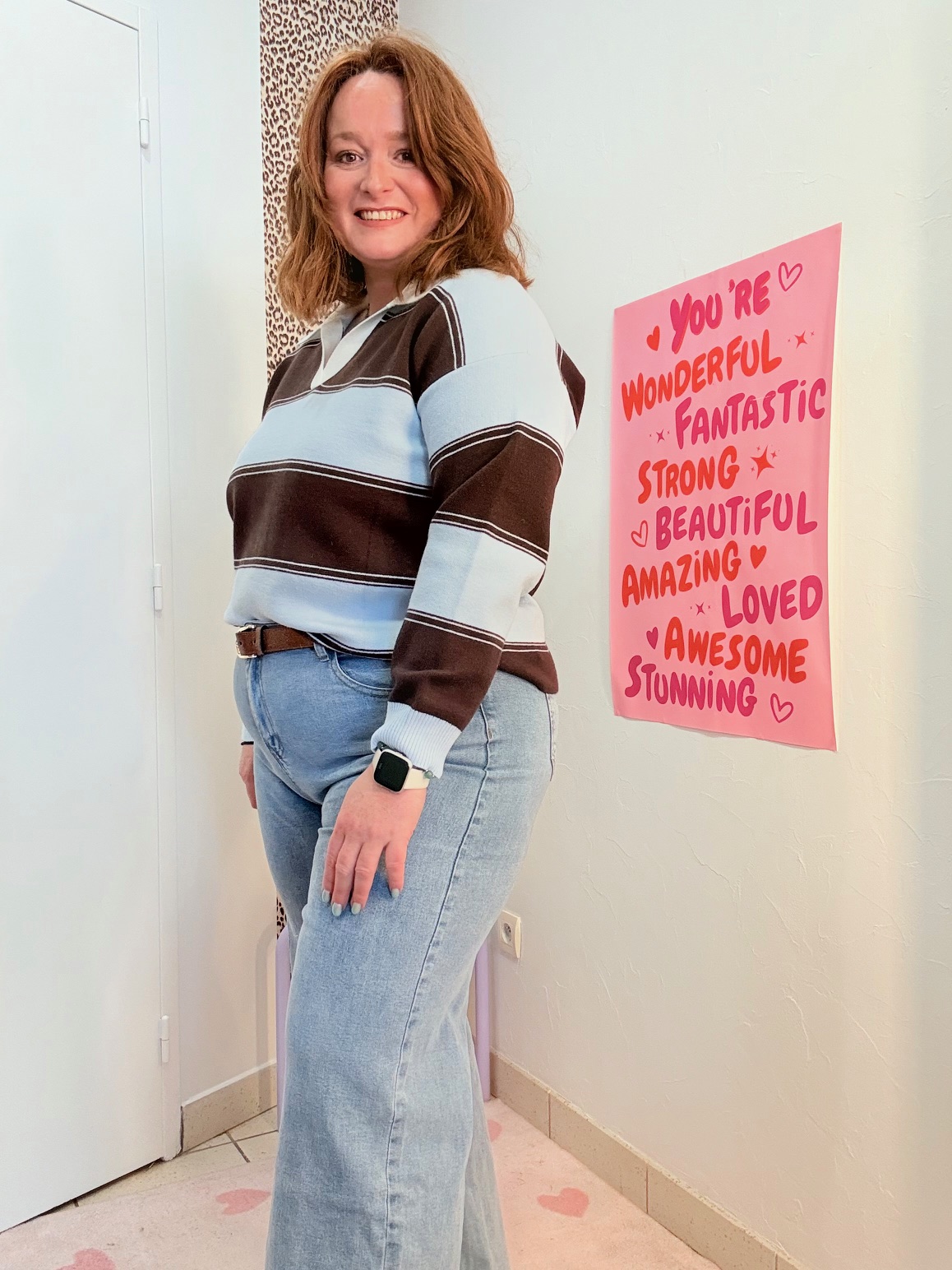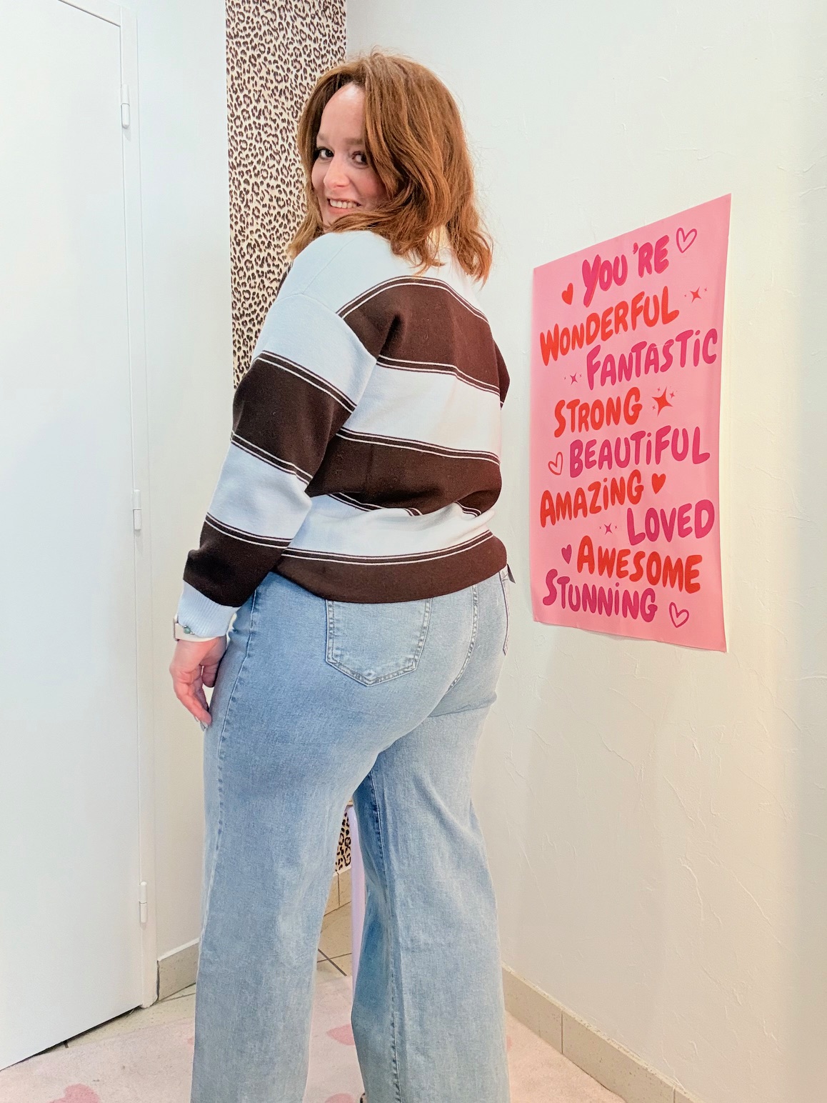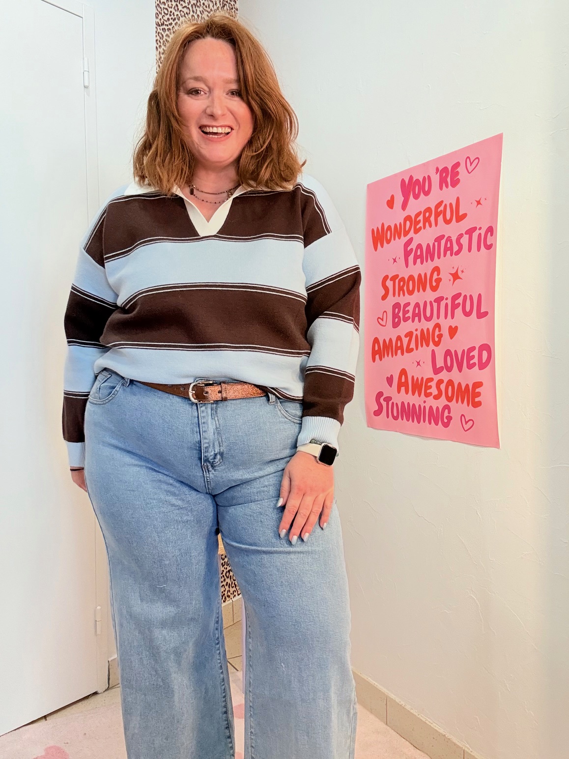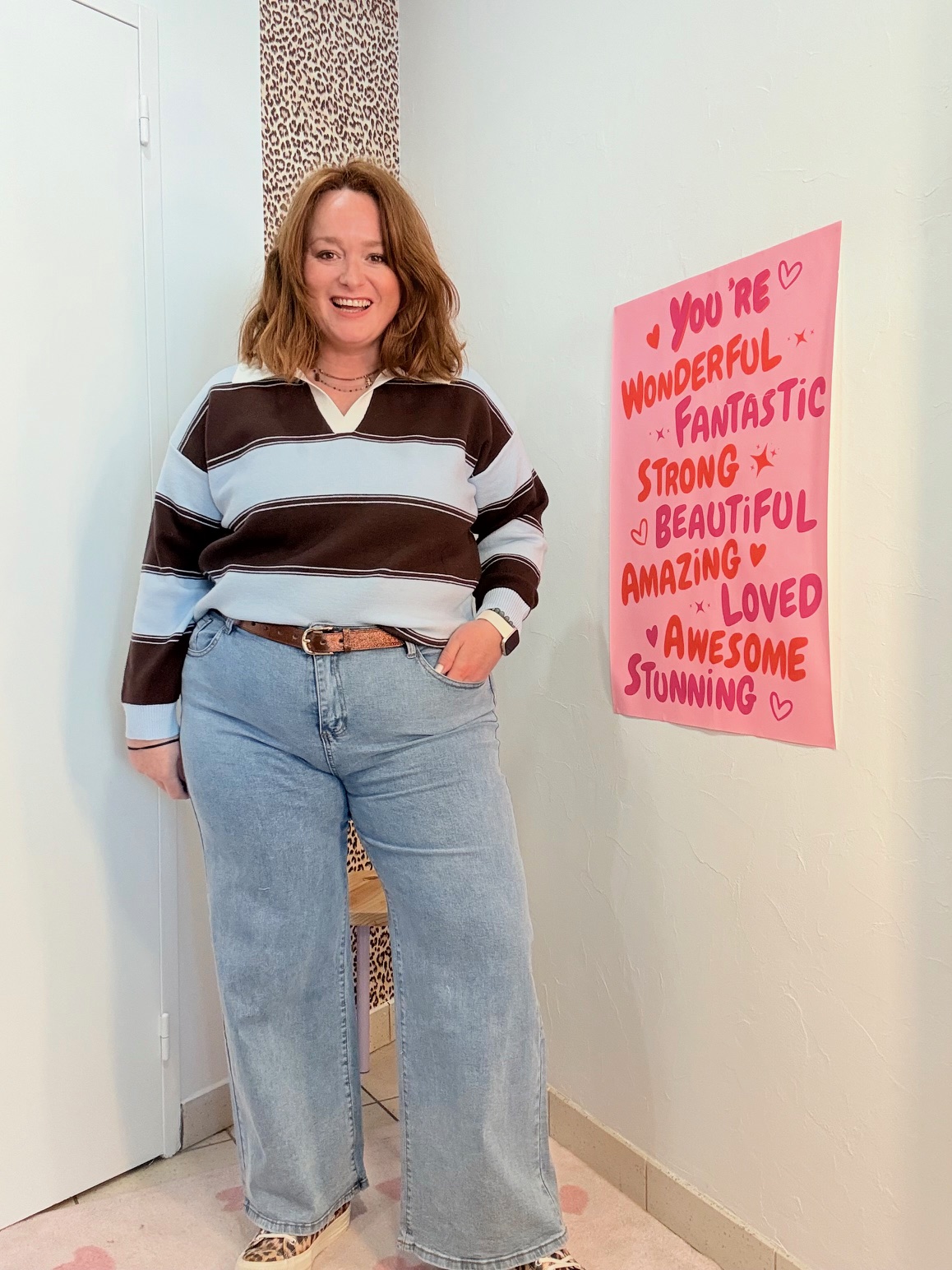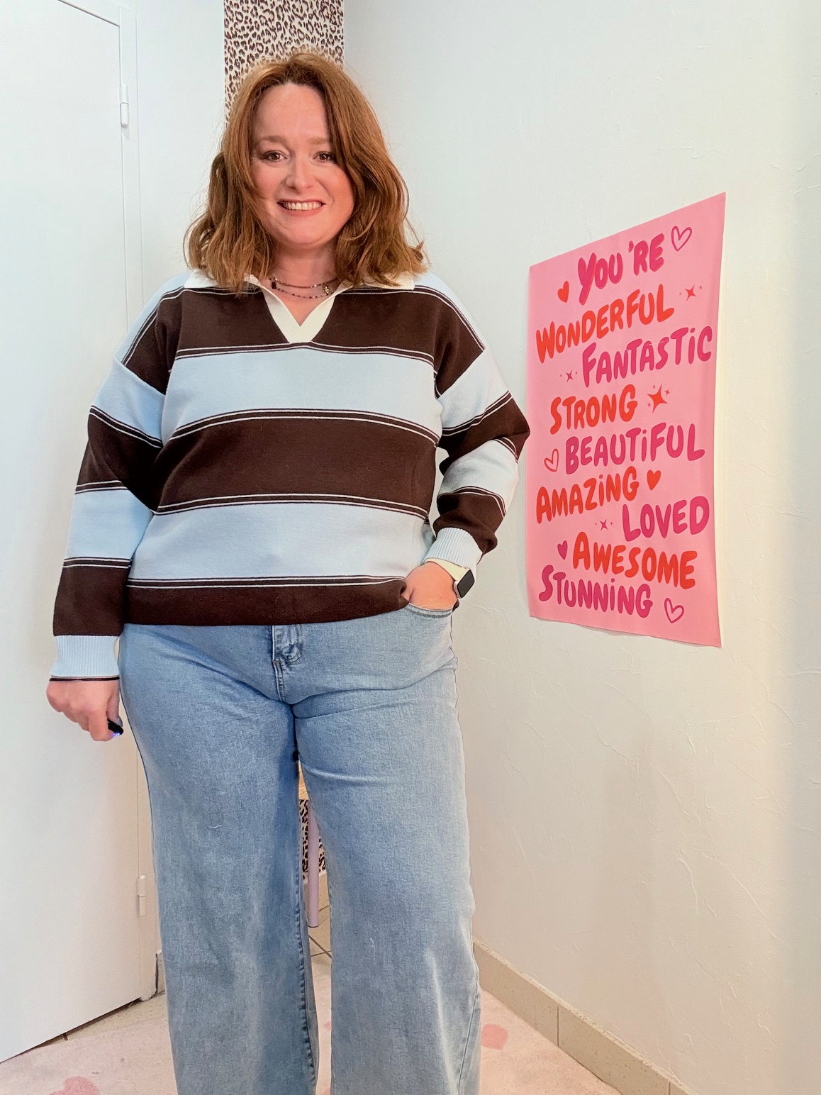 Le pull Antoine grande taille a une coupe de polo, un poil loose avec des grosses rayures.