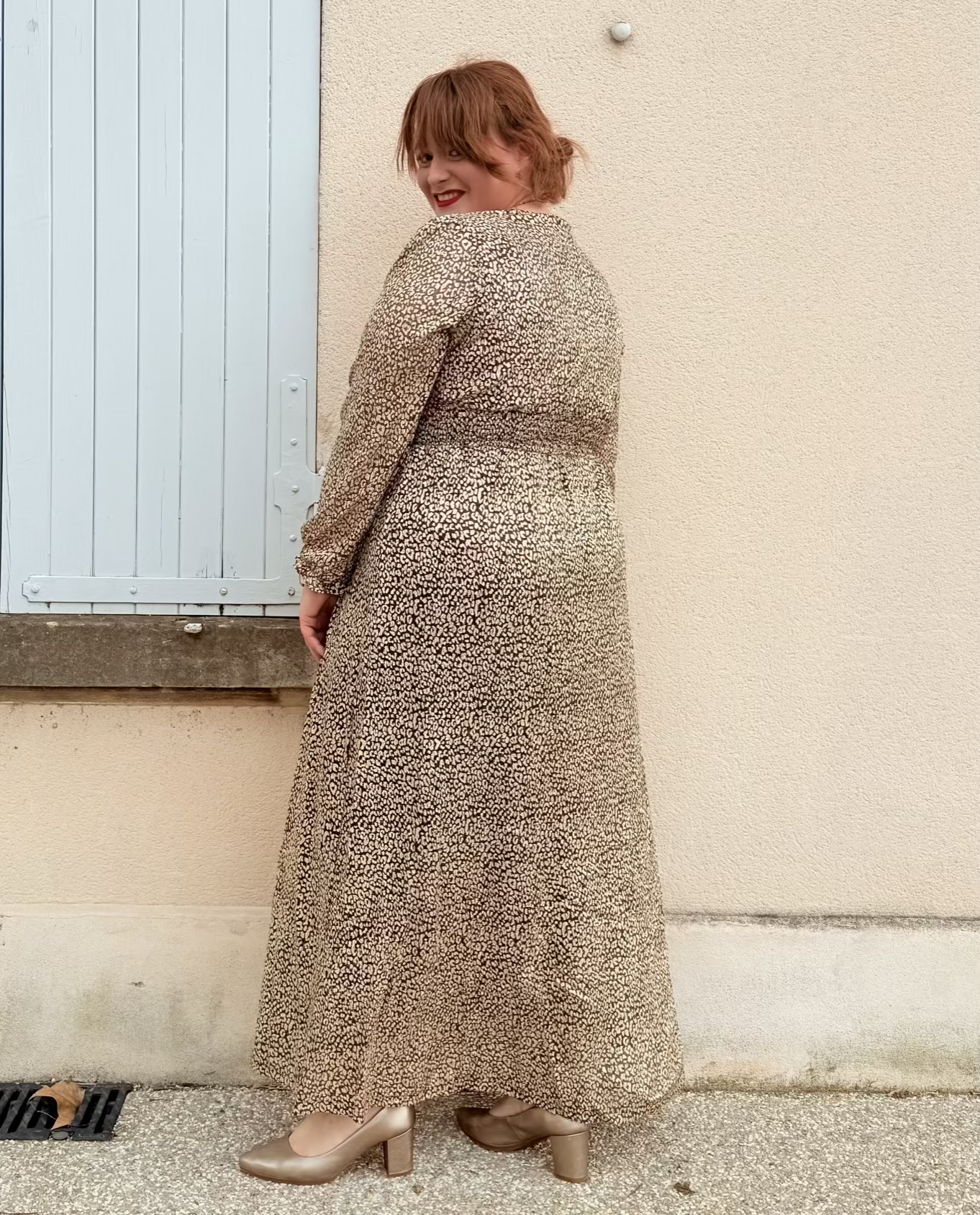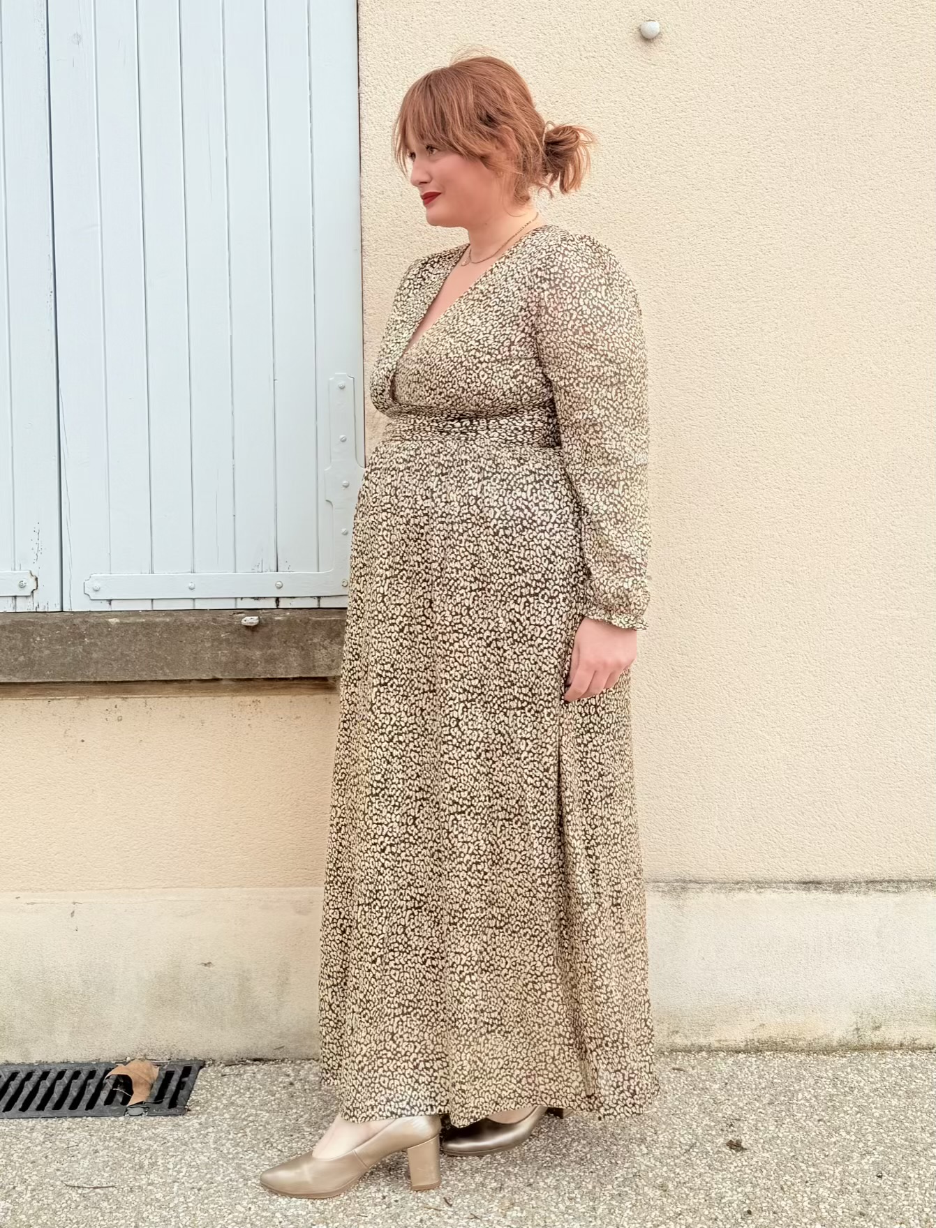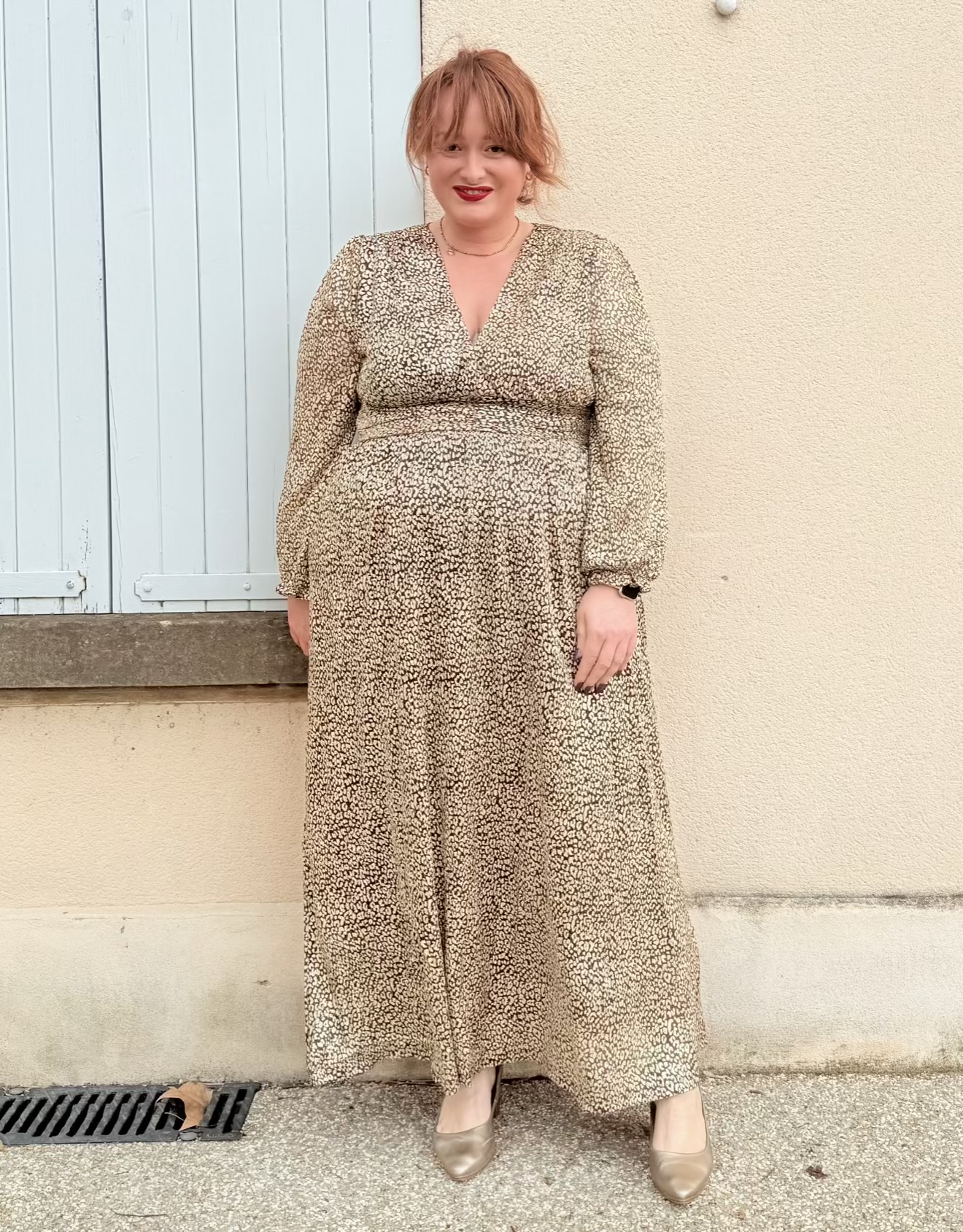 La robe Judy grande taille est longue, elle a un imprimé léopard doré, un joli décolleté et des manches longues.