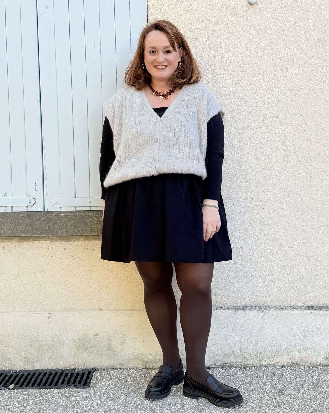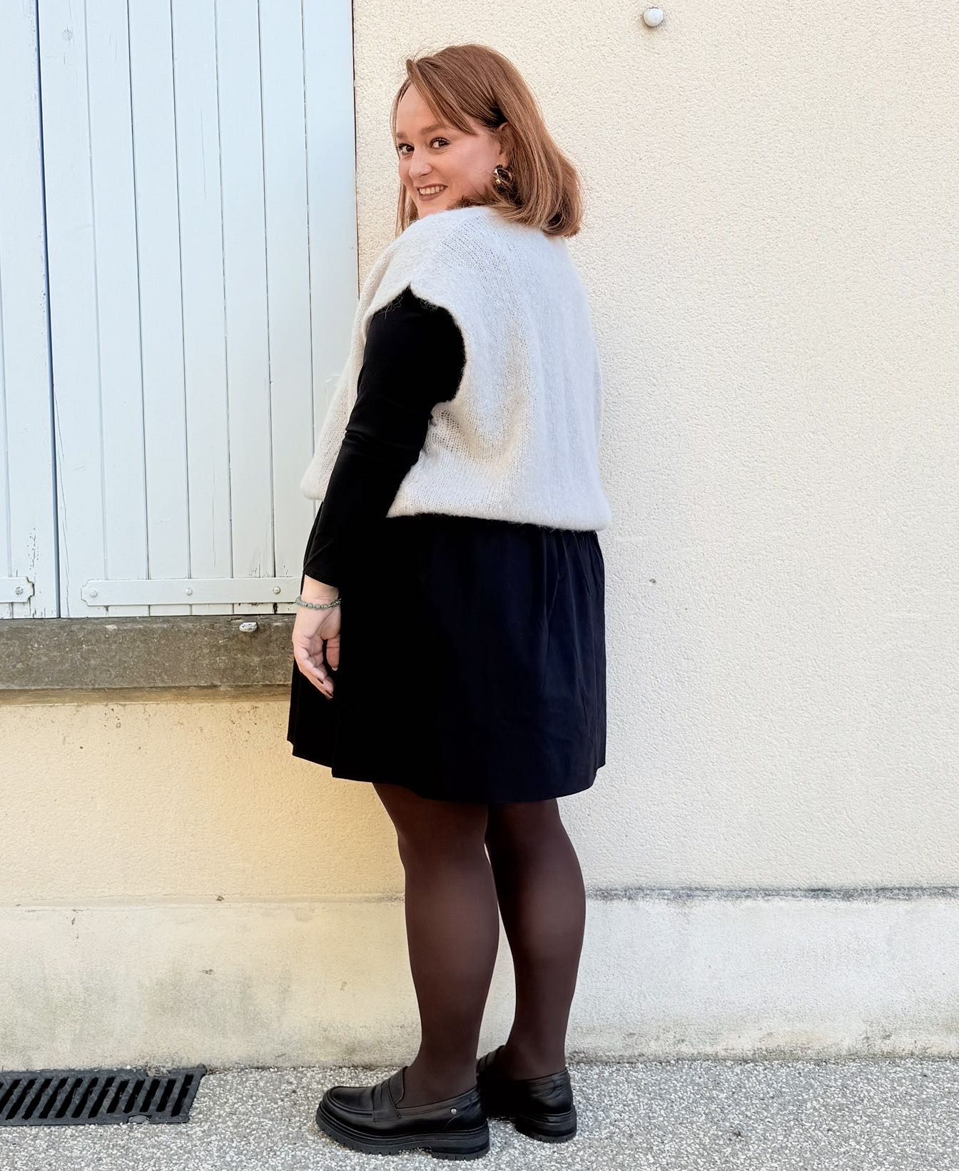 Marion porte la taille 48, qui est sa taille habituelle pour le haut et mesure 1m65.