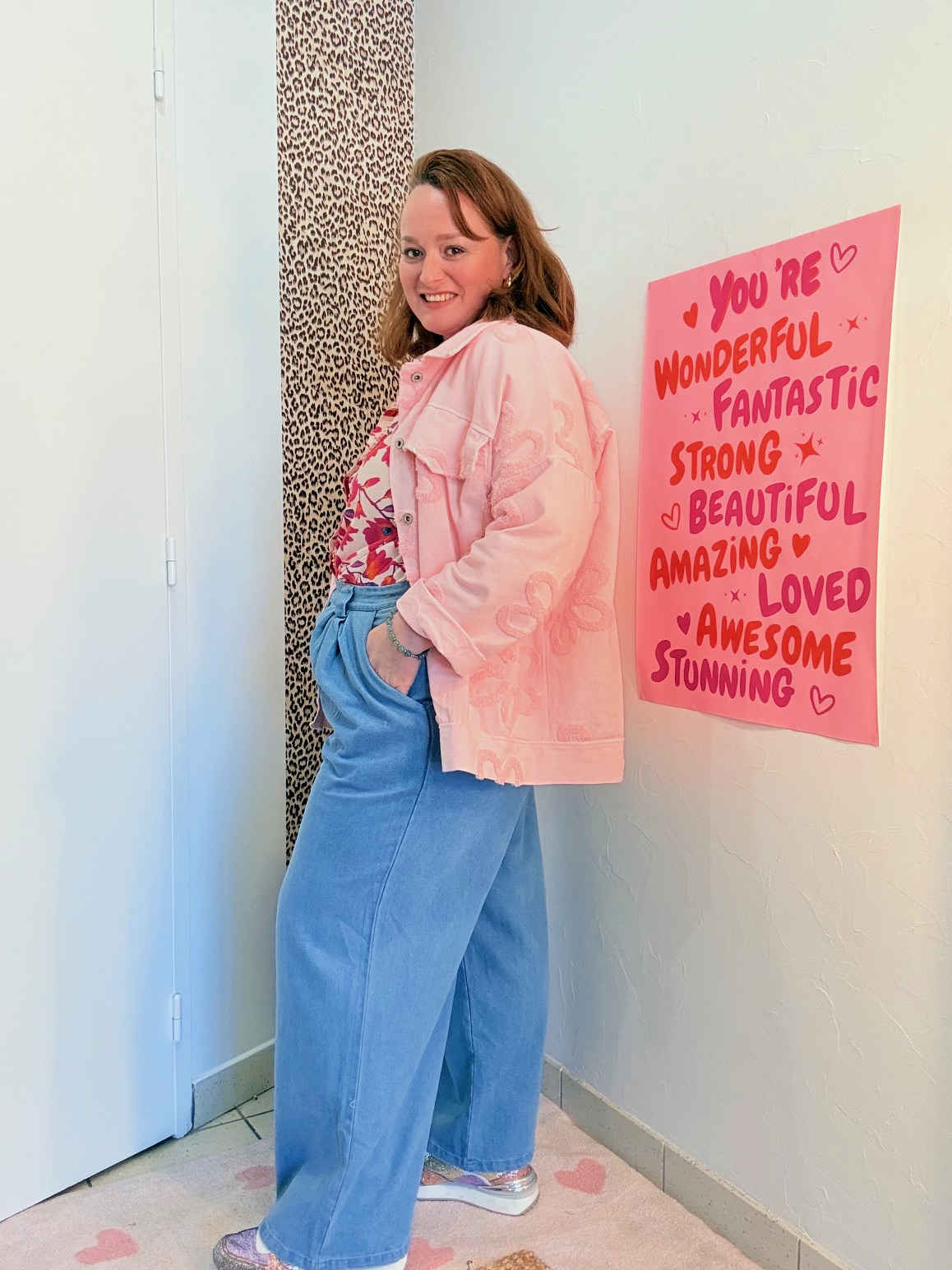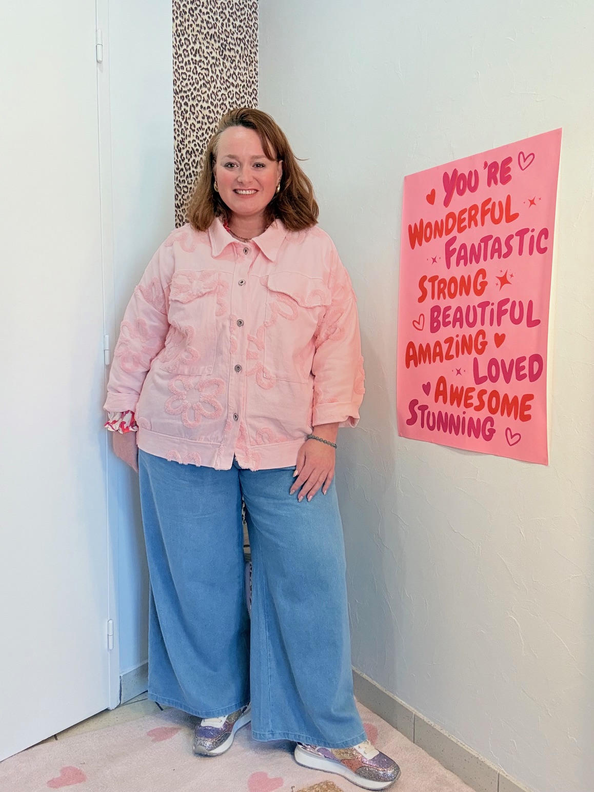 La veste en jean Joana grande taille a une coupe oversize, de grosses fleurs brodées et des poches sur le devant.