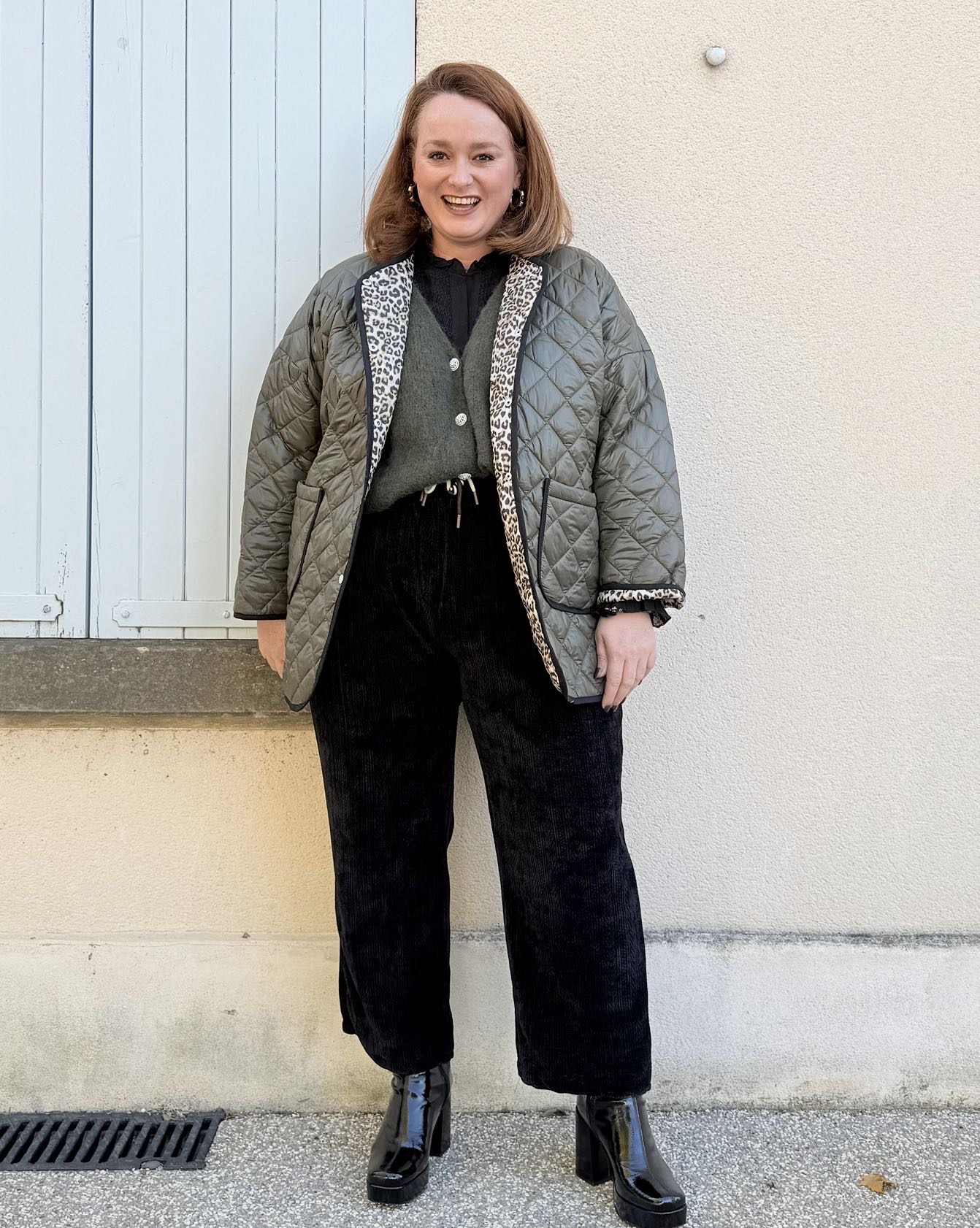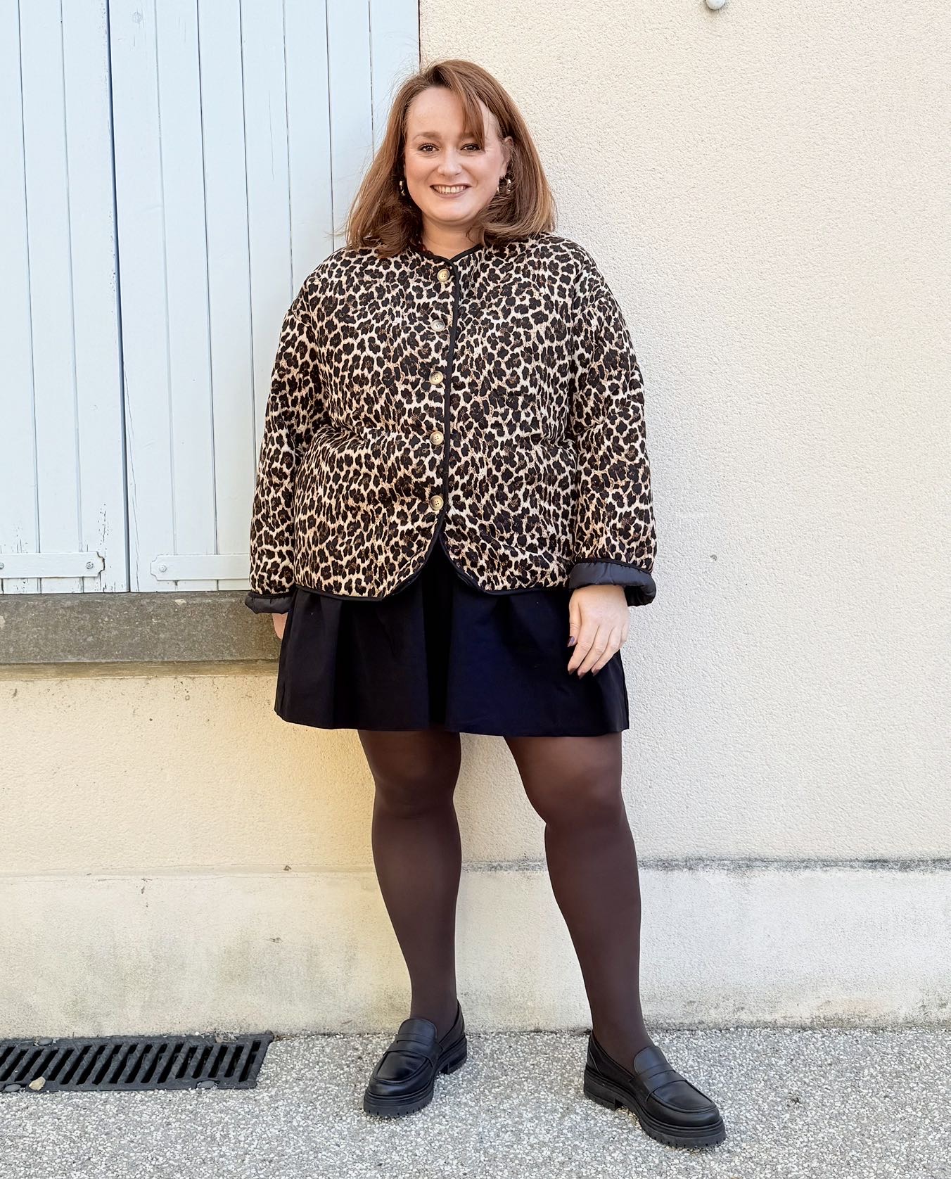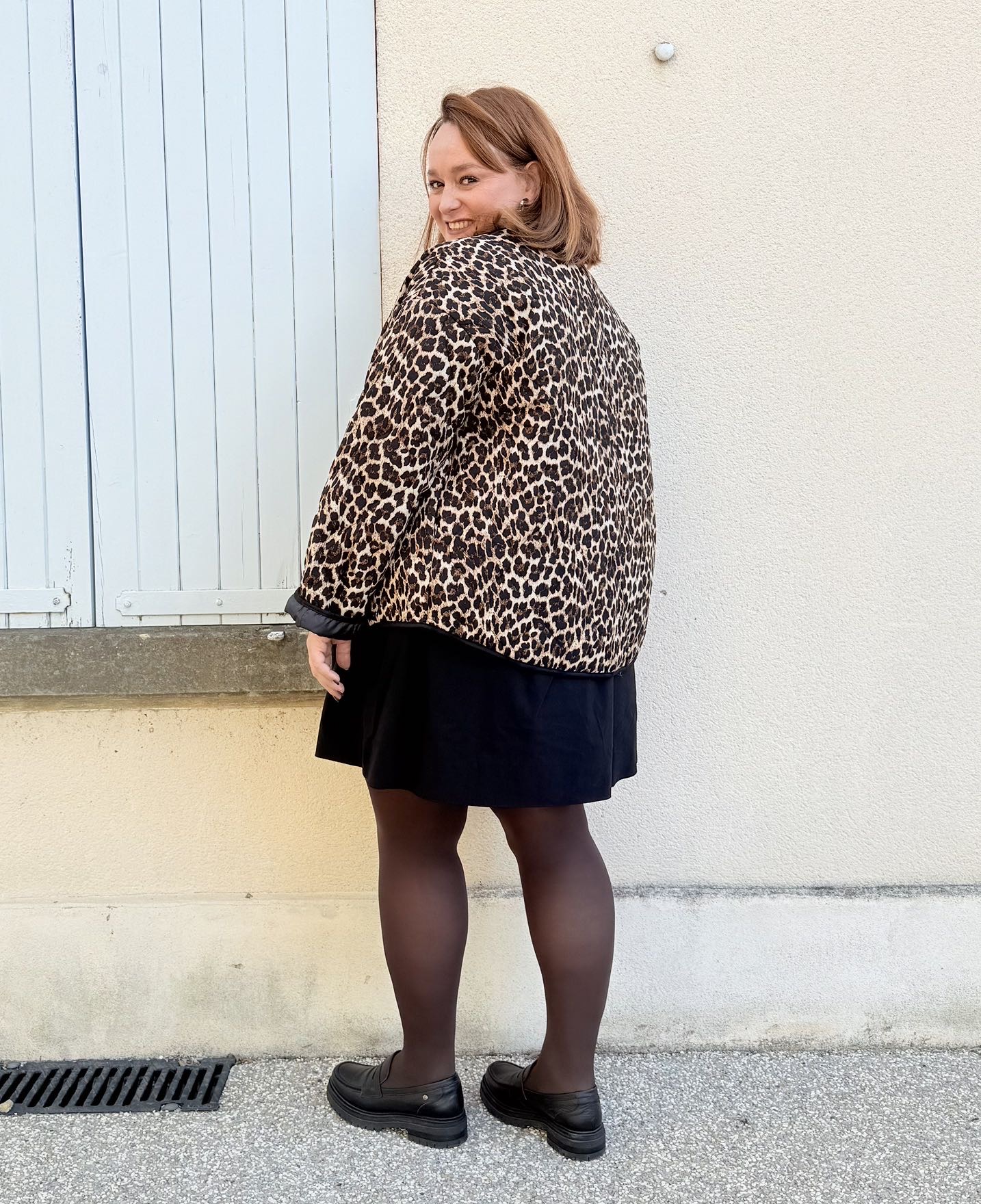 La veste Ilona grande taille est matelassée, avec un imprimé léopard, une coupe droite, des boutons et poches.