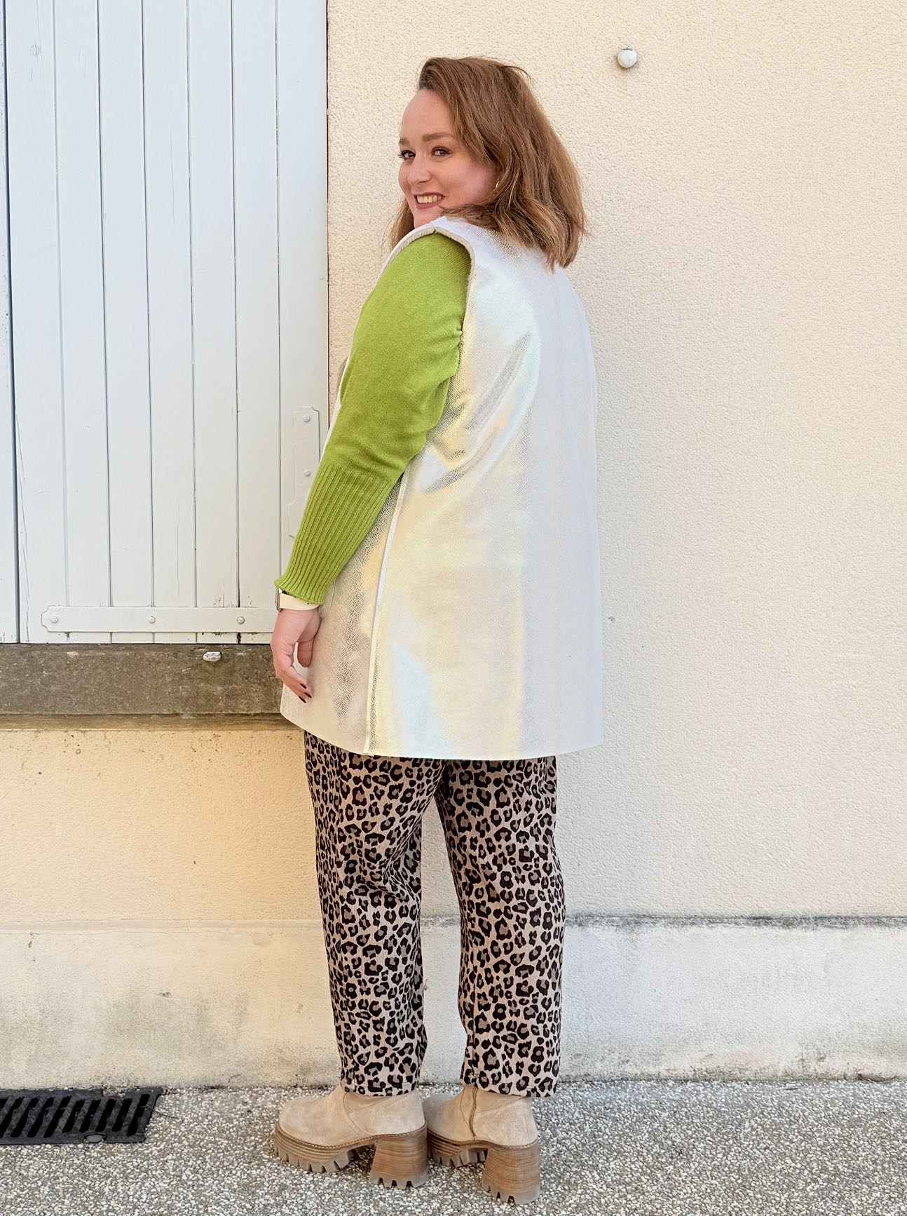 La veste Lucienne grande taille est sans manche, comme une peau lainée, elle est toute douce, avec un côté doré.